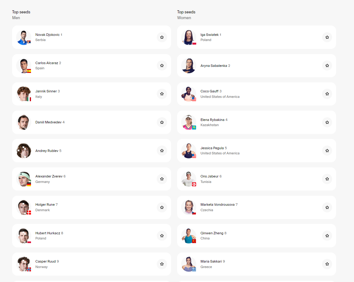 노박 조코비치, 카를로스 알카라스, 다닐 메드베데프, 야닉 시너, 안드레이 루블레프, 알렉산더 즈베레프, 홀거 루네, 후베르츠 후르카츠, 테일러 프리츠, 스테파노스 치치파스, 알렉스 드 미노, 캐스퍼 루드, 그리고트 디미트로프, 프란시스 티아포 등입니다.