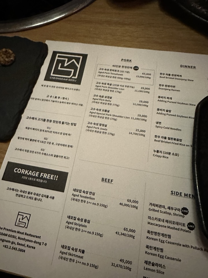 청담고수 논현점 메뉴 콜키지정책