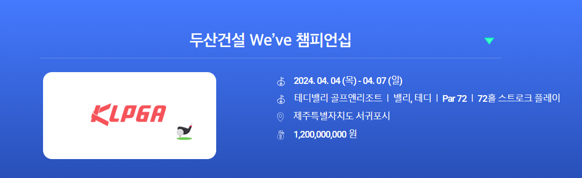 두산건설 We've 챔피언십은 2023년 8월에 신설된 대회로, 올해로 2회째를 맞이하는 대회입나다. 국내 개막전으로 열리는 이 대회에는 KLPGA 대표 선수들이 총출동한다. 총 120명의 선수들이 우승 트로피를 노리며 경쟁합니다. 초청선수는 모두 7명입니다.
