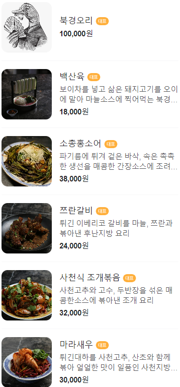 유명한 북경오리는 한마리 혹은 반마리로도 판매하며, 그외에도 면요리, 다양한 요리들이 있습니다. 쯔란갈비 및 사천식 조개볶음은 추천메뉴입니다.