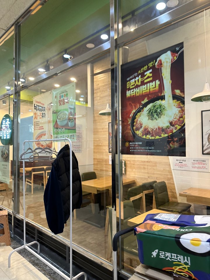 종로 르메이에르점 본죽&비빔밥 에 옷걸이가 보이고, 매장이 보입니다. 여러명 혹은 혼밥이 가능하게 다양한 형태의 테이블이 준비되어 있습니다. 포장 뿐만아니라 홀에서 먹고 갈 수 있게 되어 있습니다.