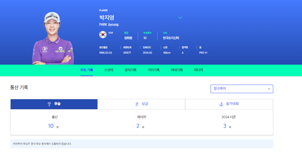 2024년 현재 박지영프로는 메이저 대회 2회 우승을 포함한 KLPGA통산 10승을 기록하고 있습니다.