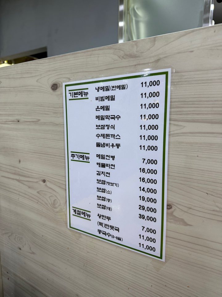 기본 메뉴는 냉메밀, 비빔메밀, 온메밀, 메밀막국수, 보쌈정식, 수제돈까스, 돌냄비우동이 있습니다.