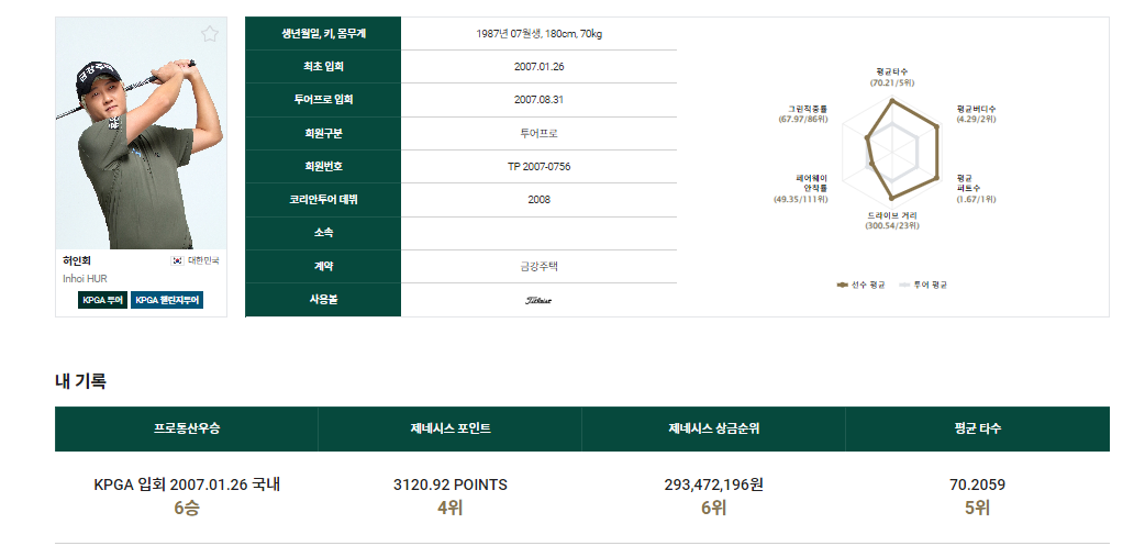 통산 20승을 해서 영구시드를 받고 싶다고 밝힌 허인회 프로는 현재 KPGA투어 통산 6승을 기록중입니다.