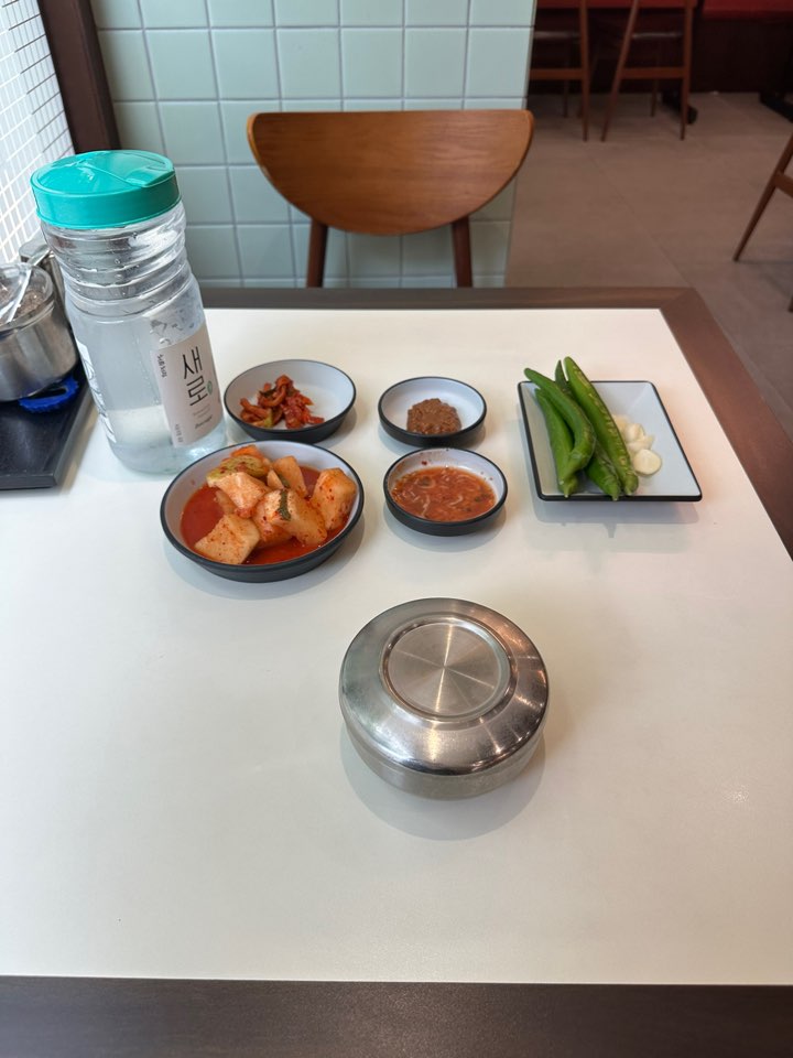 테이블 세팅은 이렇습니다. 깍두기와 무말랭이가 기본찬으로 준비되며, 고추 및 새우젓이 준비되어 있습니다.