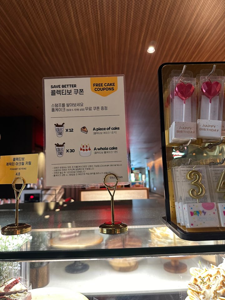 또한, 콜렉티보에서는 쿠폰제도를 하고 있는데, 음료쿠폰을 모으면 케이크로 교환해주는 스탬프제도를 운영하고 있습니다.