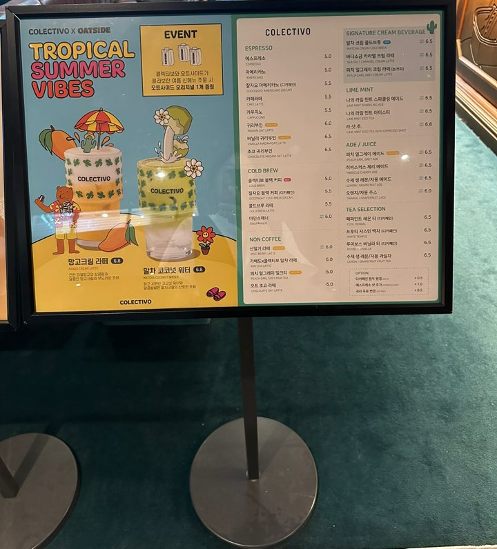 현재는 오트사이드와 망고, 말차를 이용한 음료를 콜라보 제품으로 제공하고 있습니다.