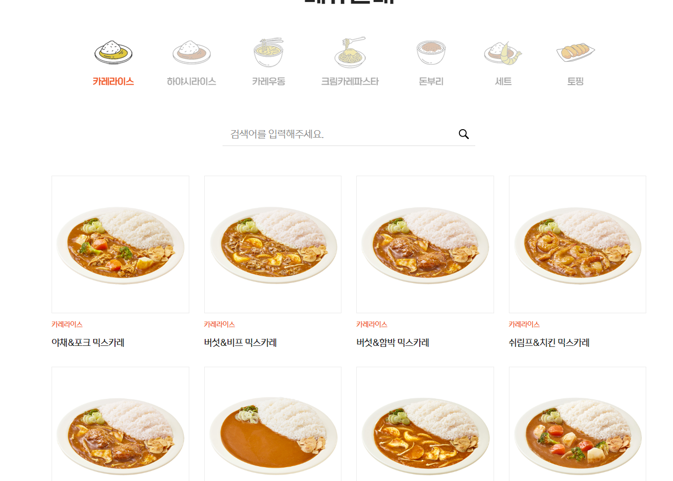 카레라이스, 하야시라이스, 카레우동, 크림카레파스타, 돈부리 등 카레를 이용한 다양한 종류의 메뉴를 구비하고 있습니다.