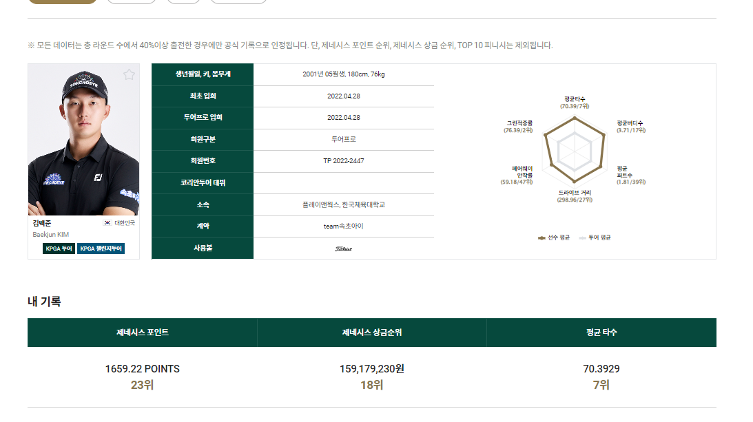 현재 2024년 KPGA투어 주목할만한 신인! 신인상포인트 2위의 김백준프로에 대해서 포스팅하겠습니다. 김백준 프로는 KPGA투어에 2024년에 데뷔해서 다양한 경기에서 꾸준한 성적을 보여주고 있습니다.