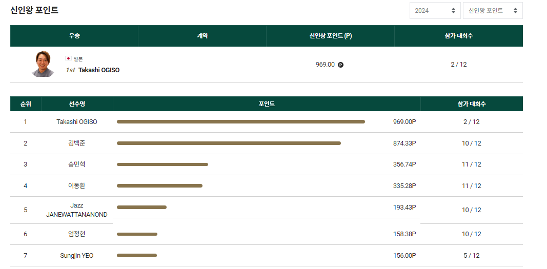 3위인 송민혁프로와의 차이가 조금 있으므로, 꾸준하게 활동한다면, 올해 신인상도 노려볼만합니다.