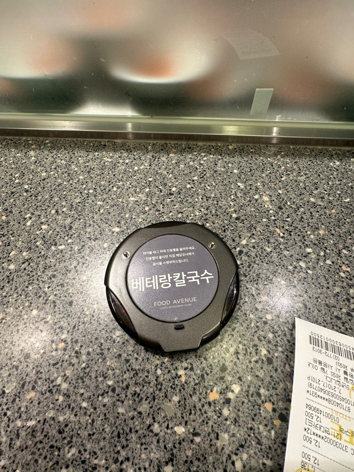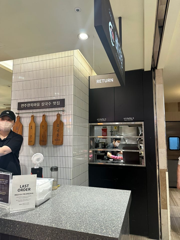 매장은 지하1층에 롯데백화점에 위치하고 있습니다. 자리는 푸드코트에서 먹을 수도 있고, 베테랑칼국수에 마련된 자리에서도 먹을 수 있습니다.
