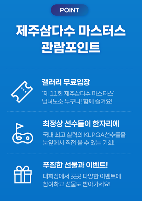 KLPGA투어의 하반기 대회 시작을 알리는 제주 삼다수 마스터스가 제주에서 8월에 열리게 됩니다. 이번 제주 삼다수 마스터스대회에는 풍성한 이벤트들과 복귀하는 출전선수들 때문에 더욱 기대가 됩니다.