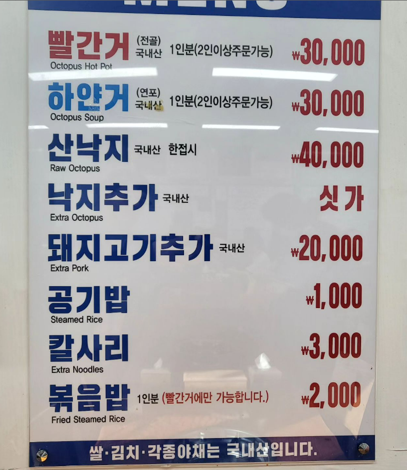 짱구네 빨간거 메인은 산낙지 전골입니다. 모두 국내산을 쓰고 있고, 1인분에 3만원입니다.