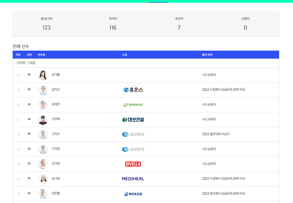 지난대회에서 우승한 윤이나프로의 계속적인 활약이 기대됩니다. 그 외에도 많은 KLPGA스타 플레이어들이 참가하는 걸 확인할 수 있습니다. 올해 우승기록이 있는 김재희프로, 노승희프로, 배소현프로, 이정민프로 및 황유민프로, 박현경 프로등이 참가합니다.