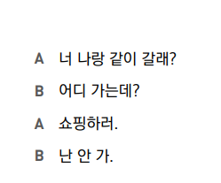 이번 대화에서는 쇼핑하러 가는데 가지 않겠다는 의견이 갈리는 상황을 대화로 제시하였습니다.