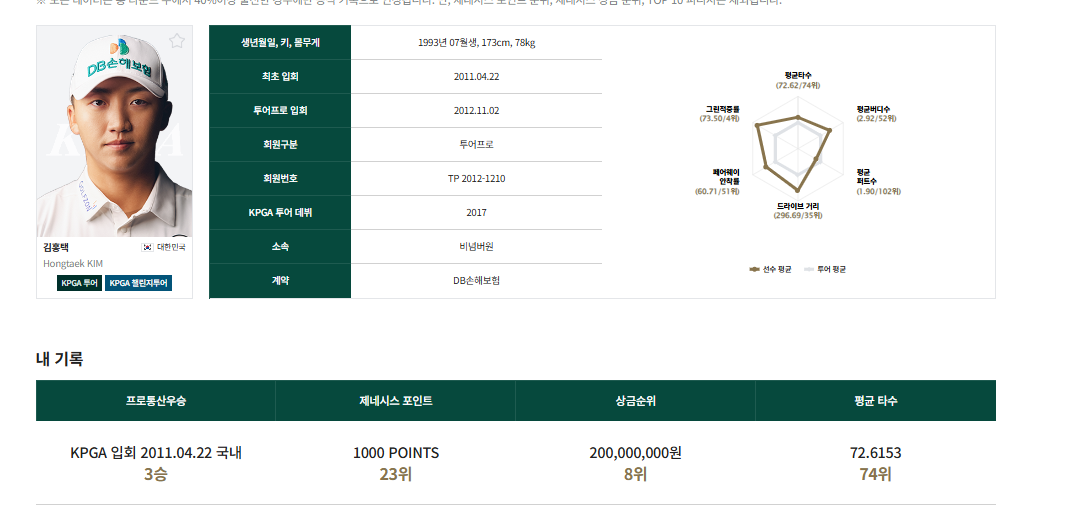 KPGA투어 - 김홍택프로 프로필