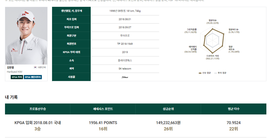 현재 주로 KPGA 투어에서 활약하고 있는 김한별프로는 KPGA투어 통산 3승을 기록하고 있습니다.