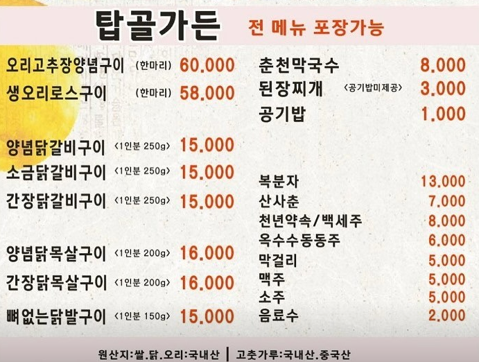 닭뿐만아니라, 오리구이도 있고, 닭목살구이 및 닭발구이, 춘천막국수등이 있습니다.