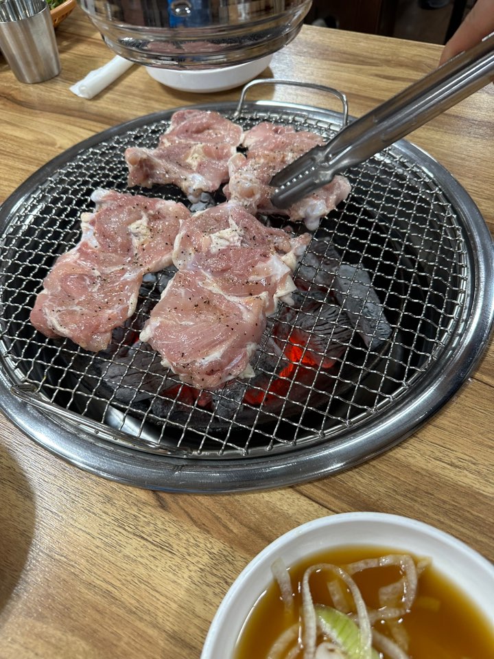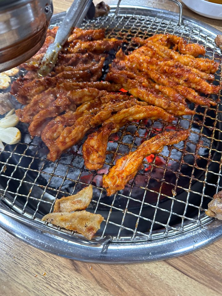 알맞운 굽기로 소금 닭갈비가 익어가고 있습니다.