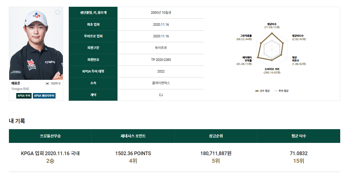 배용준프로는 현재 KPGA투어 통산 2승을 기록하고 있습니다. 2023년 제네시스 대회에서 아쉽게 준우승을 하고, 꾸준한 성적을 기록하고 있는데, 2025년 시즌에 1승을 추가해 통산 2승을 기록하고 있습니다.