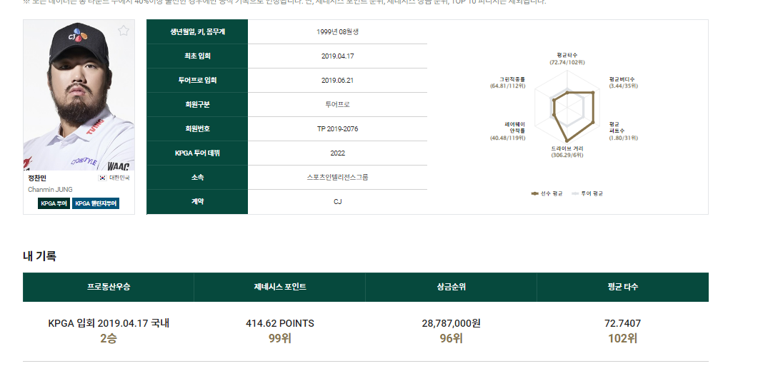 국가대표 출신인 정찬민 프로는 2019년 KPGA 입회이후 꾸준한 활약을 보여주고 있습니다.