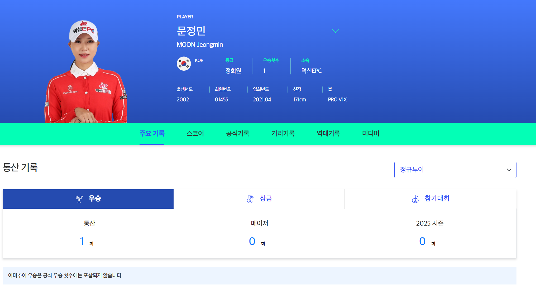 현재 문정민프로는 정규투어 1회 우승기록이 있습니다 . 하지만 드라이브 비거리 7위 및 상금 39위로 꾸준한 성적을 보여주고 있습니다.