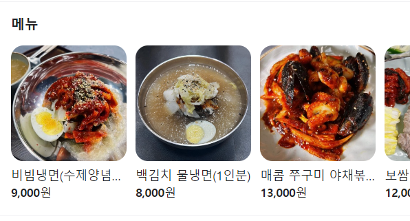 특제소스로 만든 비빔냉면을 포함해서 보쌈정식, 통삼겹 로스구이, 바싹 돼지불고기, 돼지고기 김치찌개, 참치찌개 등이 있습니다.