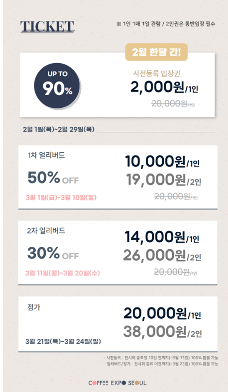 3월에 진행하는 ‘2024 서울커피엑스포’ 의 입장권 사전등록 행사를 2월 1일부터 29일까지 진행한다고 합니다. 사전등록은 ‘네이버 예약’, ‘틱고’, ‘카카오 예약하기’를 통해 가능하며, 정가 대비 90% 할인 혜택이 제공됩니다.