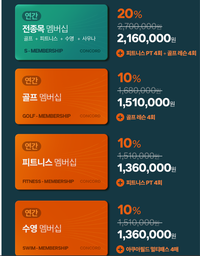 스타필드 수원 콩코드 홈페이지에 설명한 것과 같이 피트니스, 골프, 수영, 사우나 시설을 갖춘 ALL-INCLUSIVE FITNESS 클럽이 콩코드 (CONCORD) 입니다. 팀 콩코드와 메타버스 GX, 바디 케어까지 디테일한 시스템으로 더 멋진 몸을 넘어 더 멋진 삶을 누릴 수 있는 프리미엄 피트니스 클럽입니다.