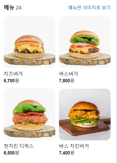 바스버거에는 다양한 메뉴가 있는데, 치즈버거, 바스버거, 바스 치킨버거등 다양한 종류의 버거를 맛볼 수 있습니다.