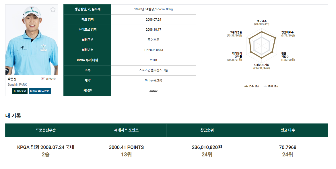 현재 KPGA투어 통산 2승을 기록하고 있는 박은신 프로입니다.