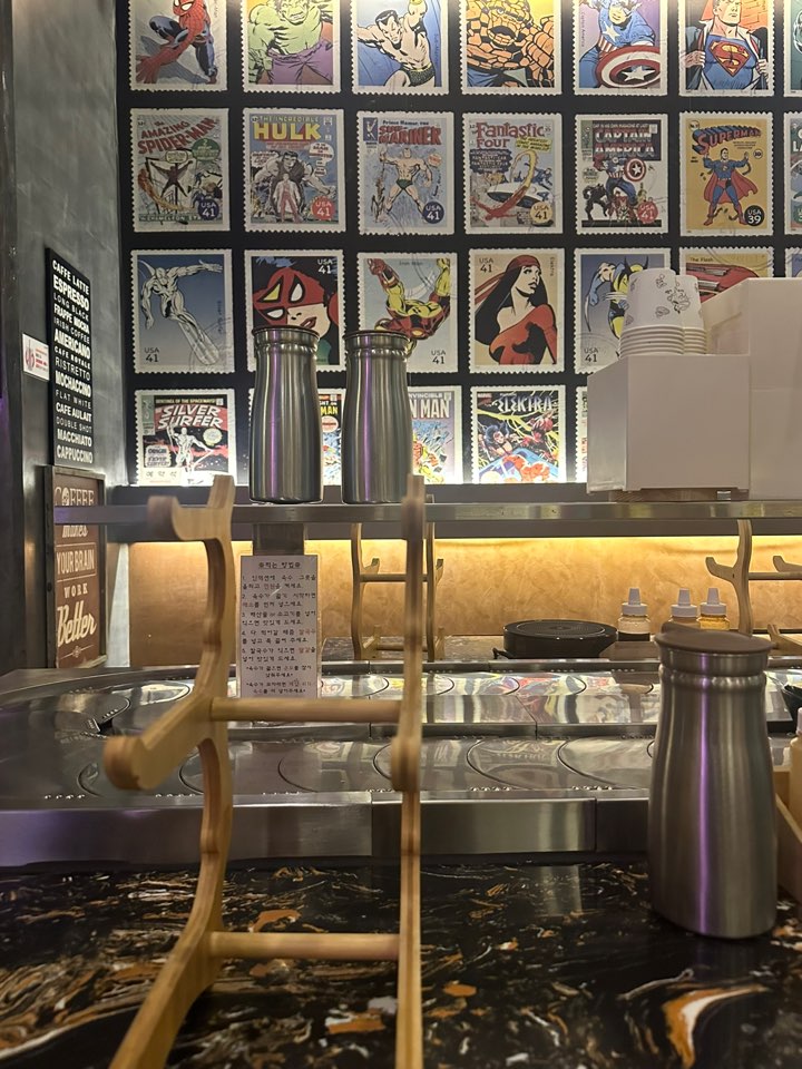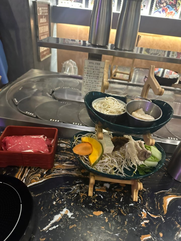 힙한 느낌의 공샤브는 1인을 위한 거치대 및 공간이 준비되어 있었고, 회전 테이블을 보니 마치 회전초밥집같은 느낌도 들었습니다.