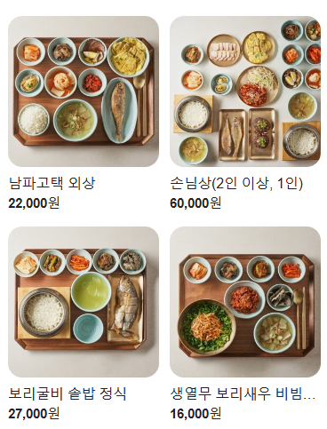 정갈하고, 깔끔한 한상을 즐길 수 있는 남파고택의 메뉴들입니다. 자신의 기호에 따라서 단품 혹은 한상을 주문할 수 있습니다.