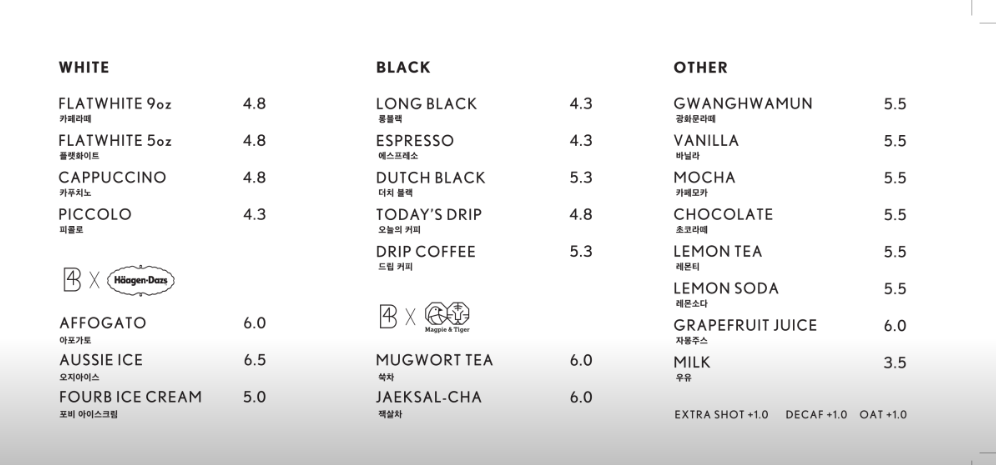 다양한 종류의 커피메뉴가 준비되어 있으며, 커피를 마시지 않는 사람들을 위한 차 메뉴도 준비되어 있습니다.