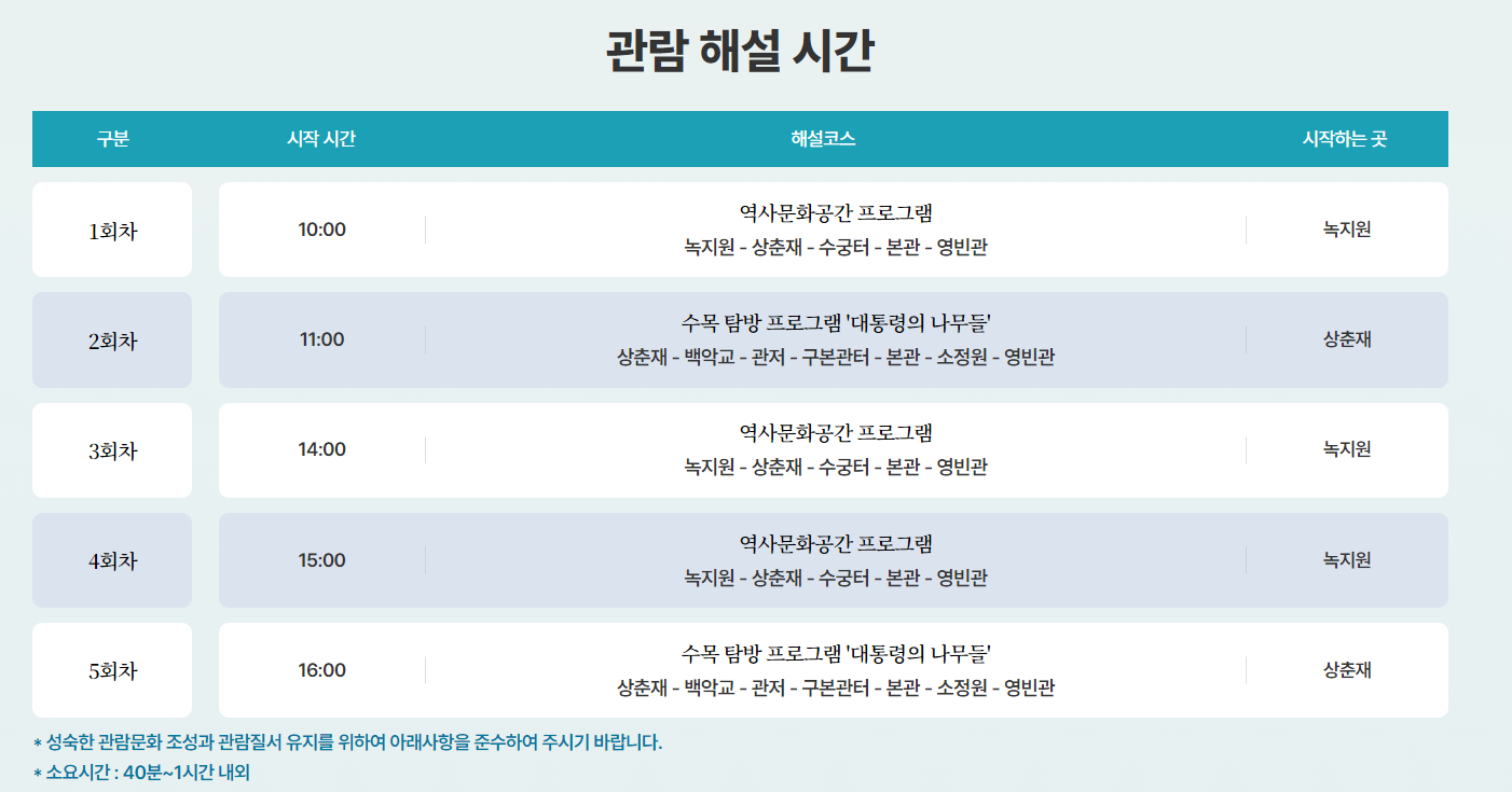 아래 해설시간을 참고해서, 청화대 관람예약을 한다면 이해도 높아지는 시간이 될 것 같습니다.