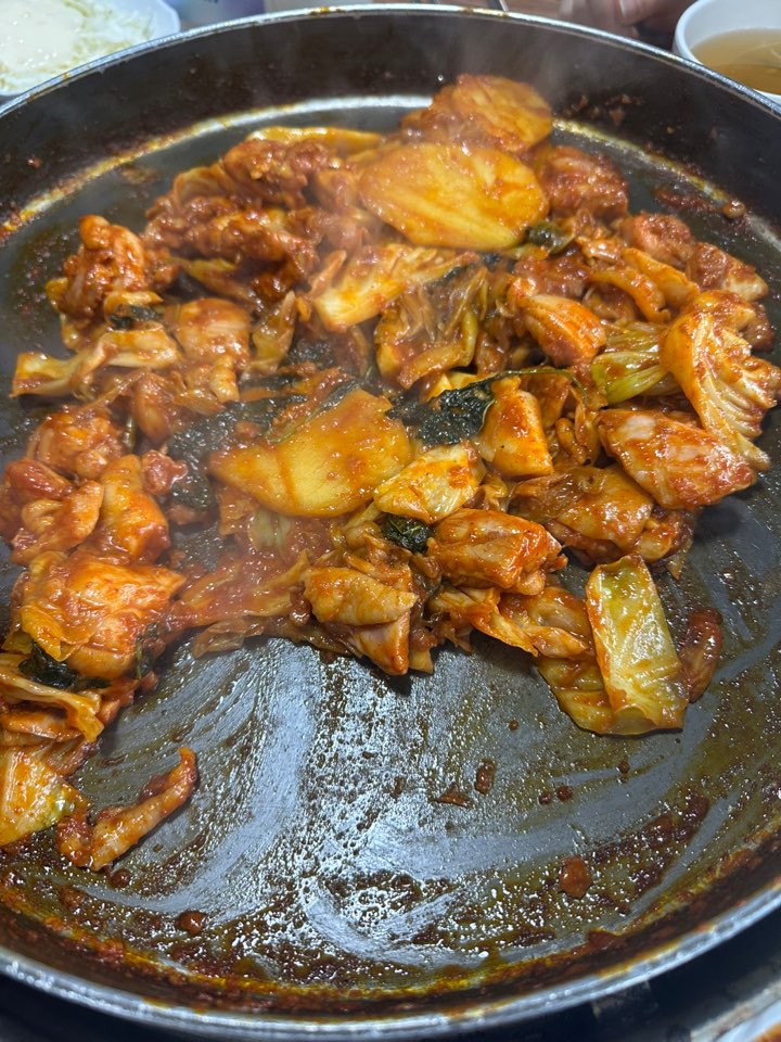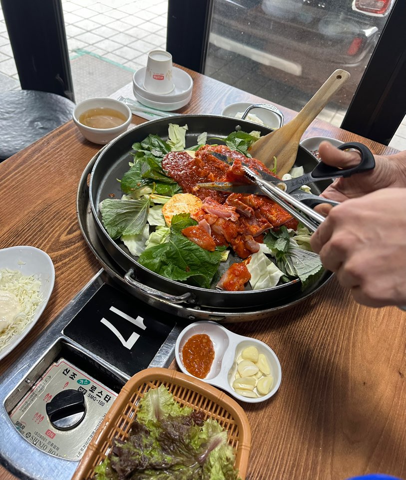주문하면, 조리되지 않은 닭갈비가 나옵니다. 불판에 눌러붙지 않게 저어주면서 닭갈비가 익혀지기를 기다립니다. 바쁜 시간이 아니면 조리를 도와주십니다.