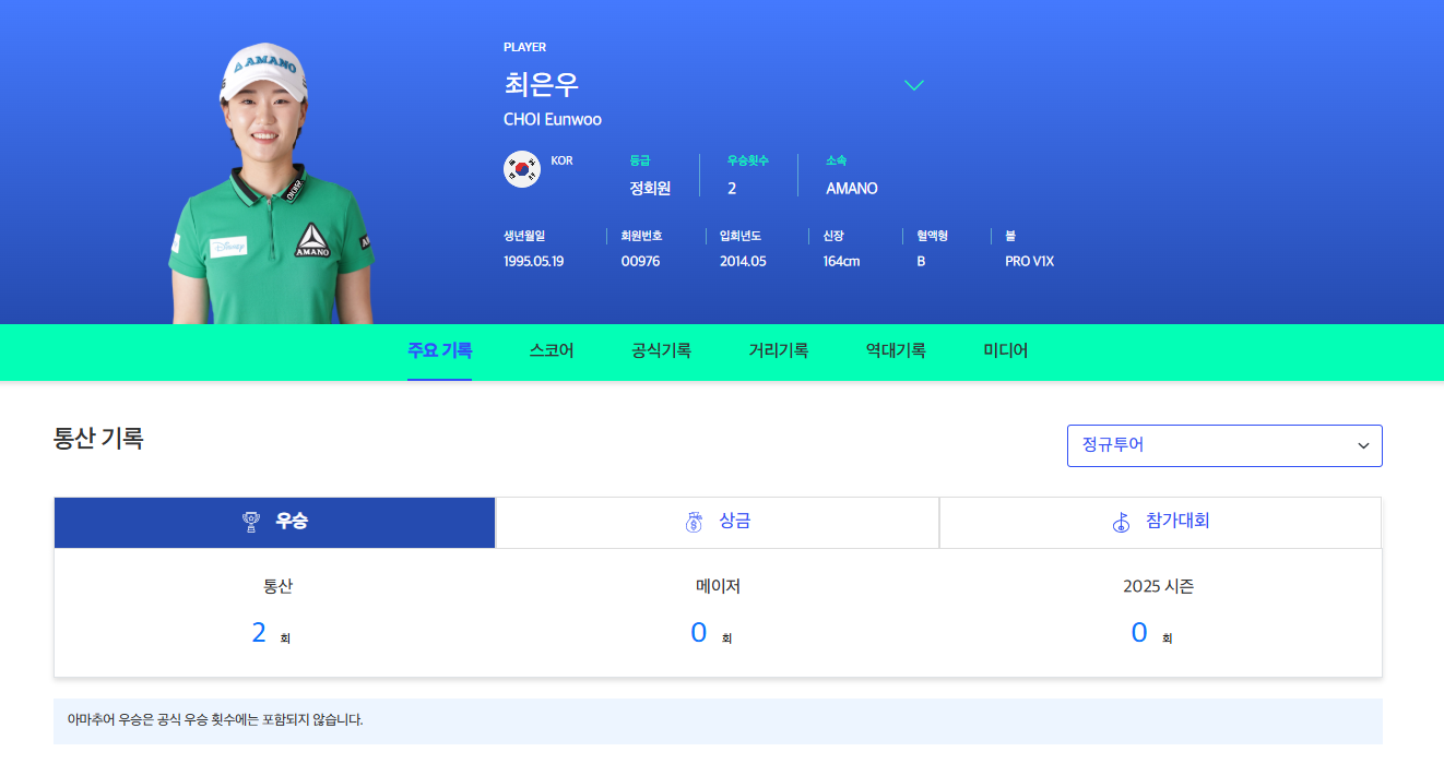 현재 최은우프로는 KLPGA에서 통산 2승을 기록하고 있습니다. 2승 모두 같은 대회인 넥센 세인트나인 마스터즈에서 2023년, 2024년 우승하였습니다.