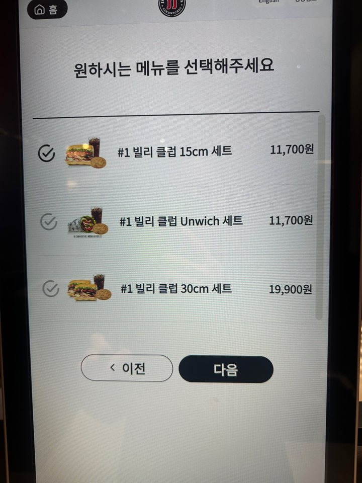 빌리클럽 15cm 세트 메뉴를 시킨 모습입니다.