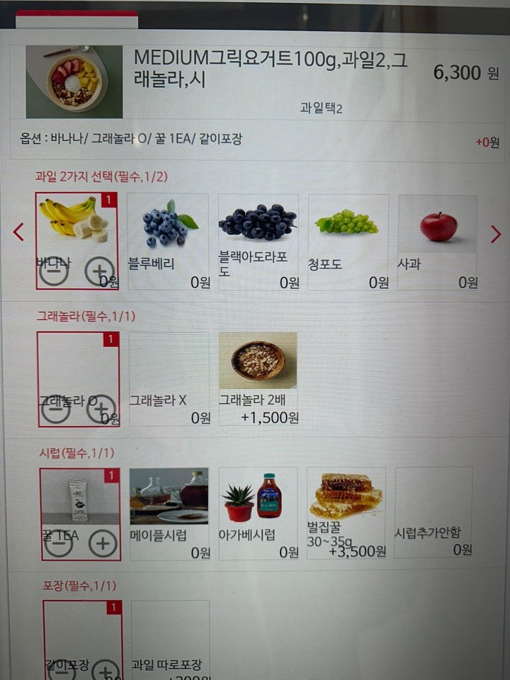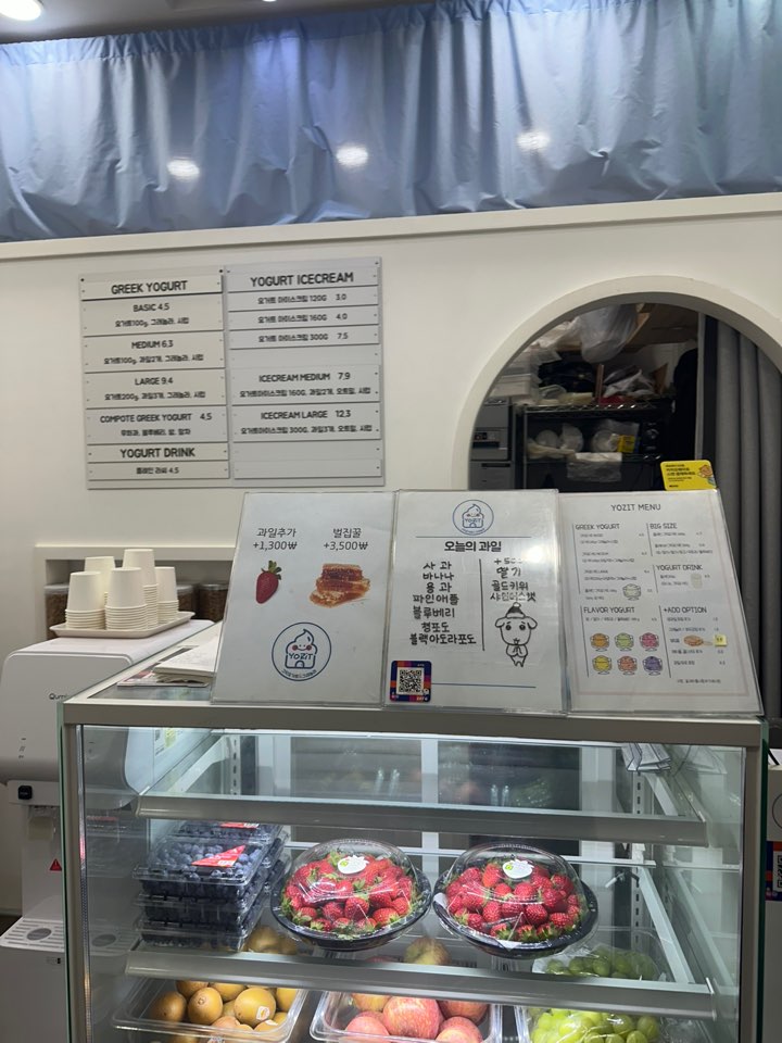 요지트 메뉴는 사이즈로 구분되는데 취향에 맞게 과일 및 토핑을 고를 수 있습니다.