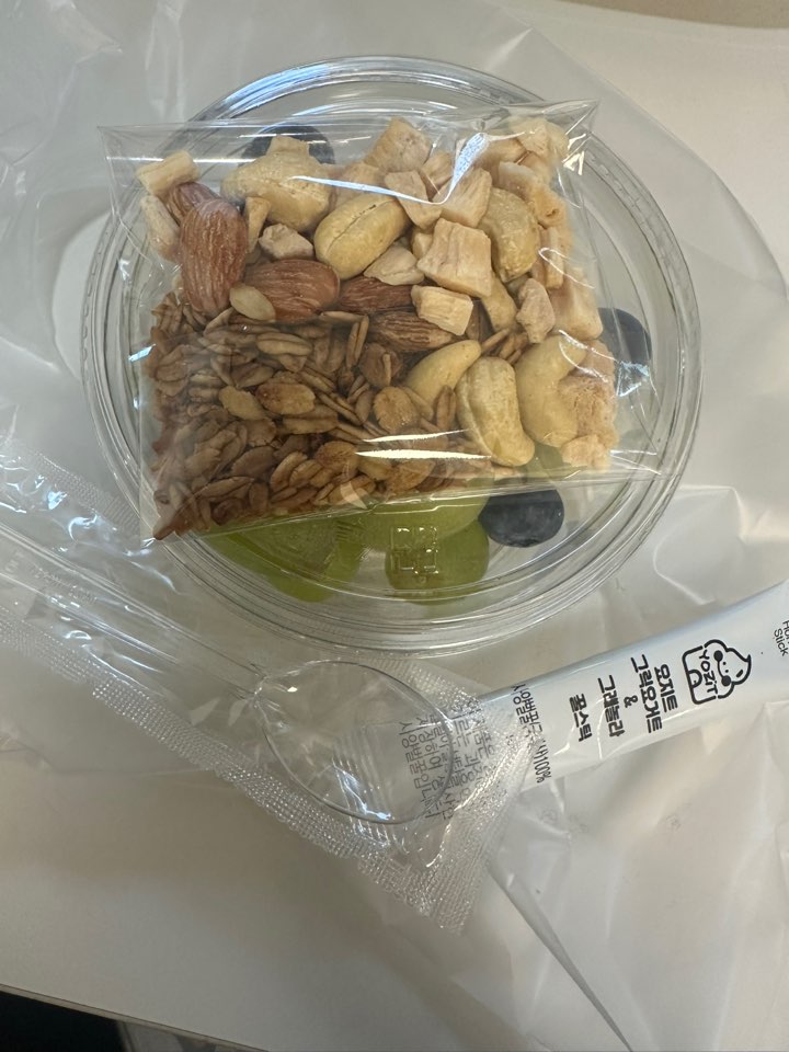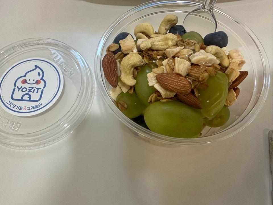그래놀라 및 견과류 신선한 과일들과 꾸덕한 요지트의 그릭요거트였습니다.