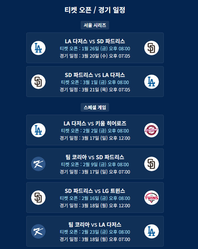 3월 1일 서울시리즈 2차전 다저스-샌디이에고 티켓이 오픈됩니다.