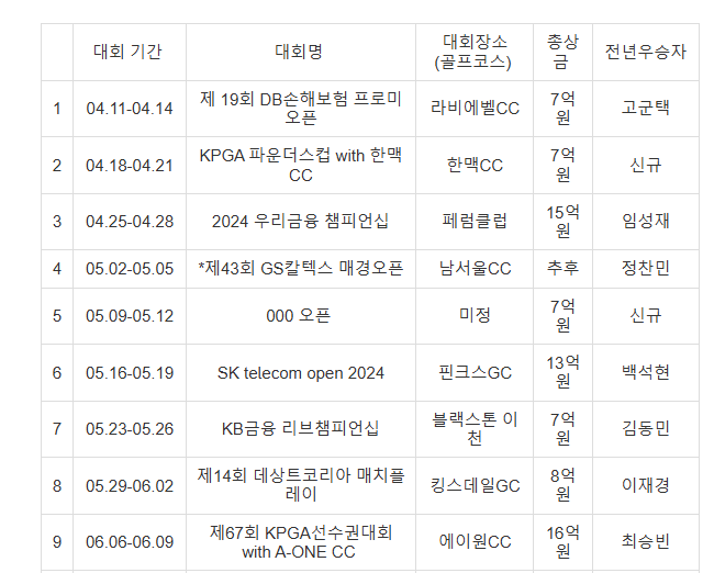| 4 | 05.08-05.11 | KPGA 클래식 | 미정 | 7억원 | 김찬우 |