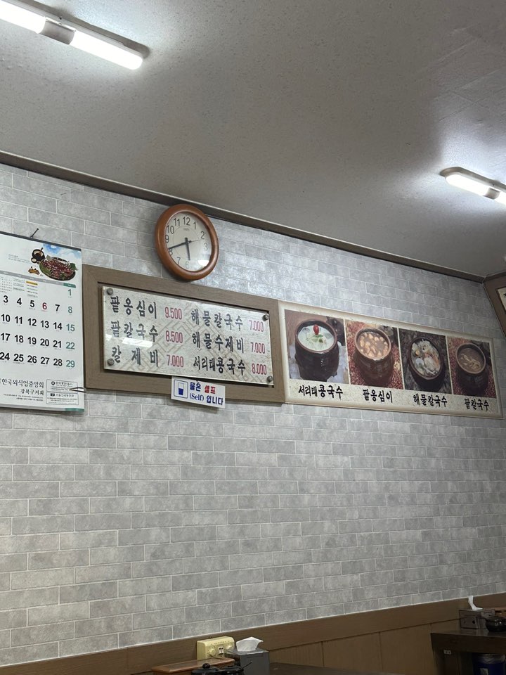 메뉴로는 서리태콩국수, 팥옹심이, 팥칼국수, 칼제비, 해물칼국수, 해물수제비등이 있습니다.