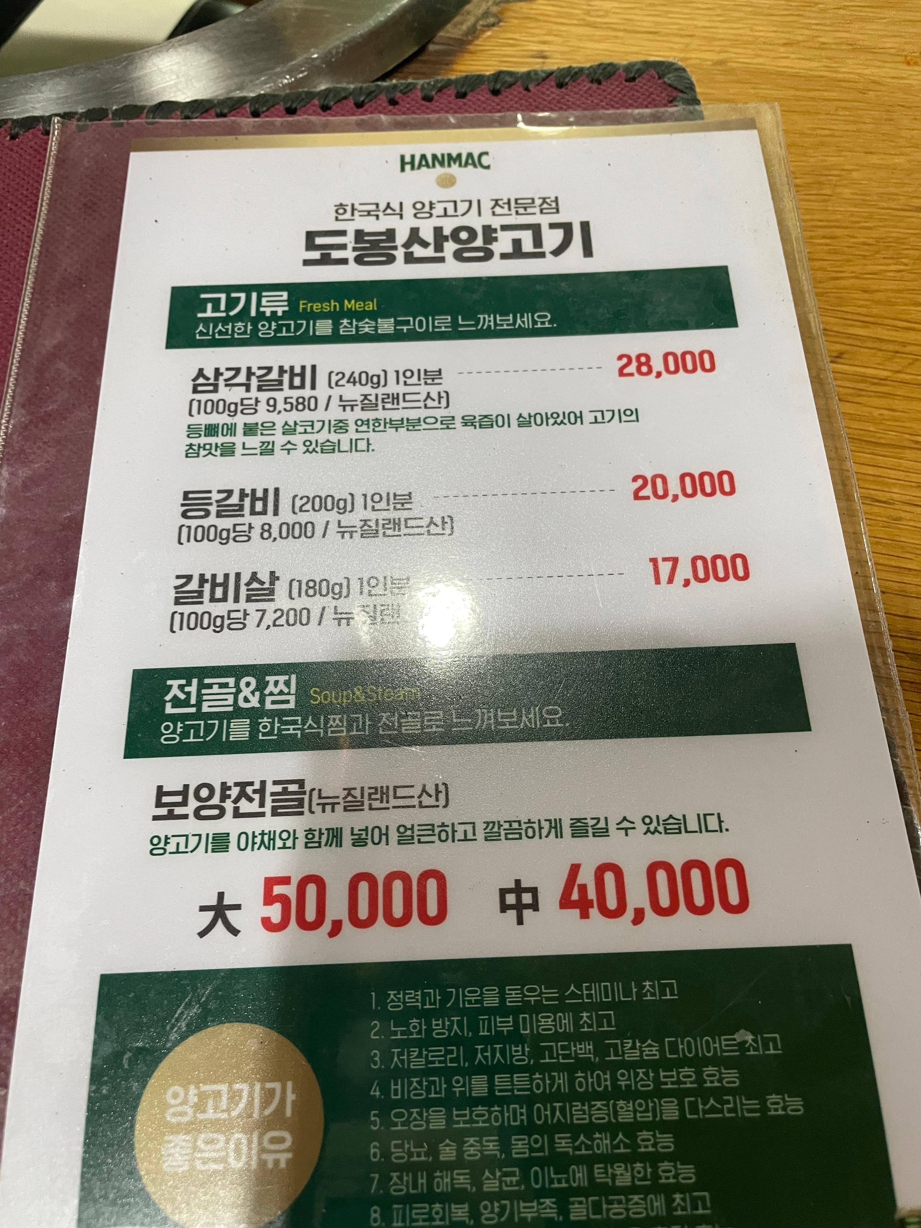 메뉴는 삼각갈비나 등갈비 양의 다양한 부위를 취급하면서 보양전골도 메뉴에 있으니 다양한 양고기 요리를 즐길 수 있는 곳입니다.
