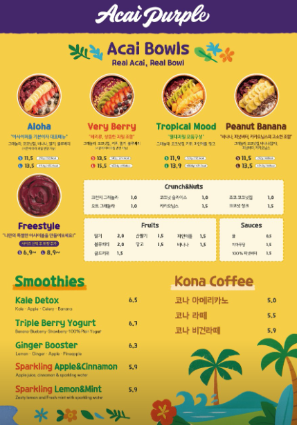 알로하 베리베리 트로피칼무드 등 다양한 아사이볼이 준비되어 있으며, 기호에 맞게 고를 수 있는 프리스타일 메뉴도 있습니다. 또한 디톡스를 위한 스무디, 커피도 준비되어 있습니다.