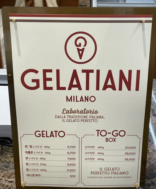 젤라또, 젤라또 라떼, 아포가토 등이며, 젤라또는 컵이나 콘 형태로 주문할 수 있고, 테이크아웃용 박스도 있습니다. 젤라또 외에 커피 메뉴도 판매하며, 매장에서는 젤라또와 커피를 활용한 다양한 메뉴를 제공힙니다.