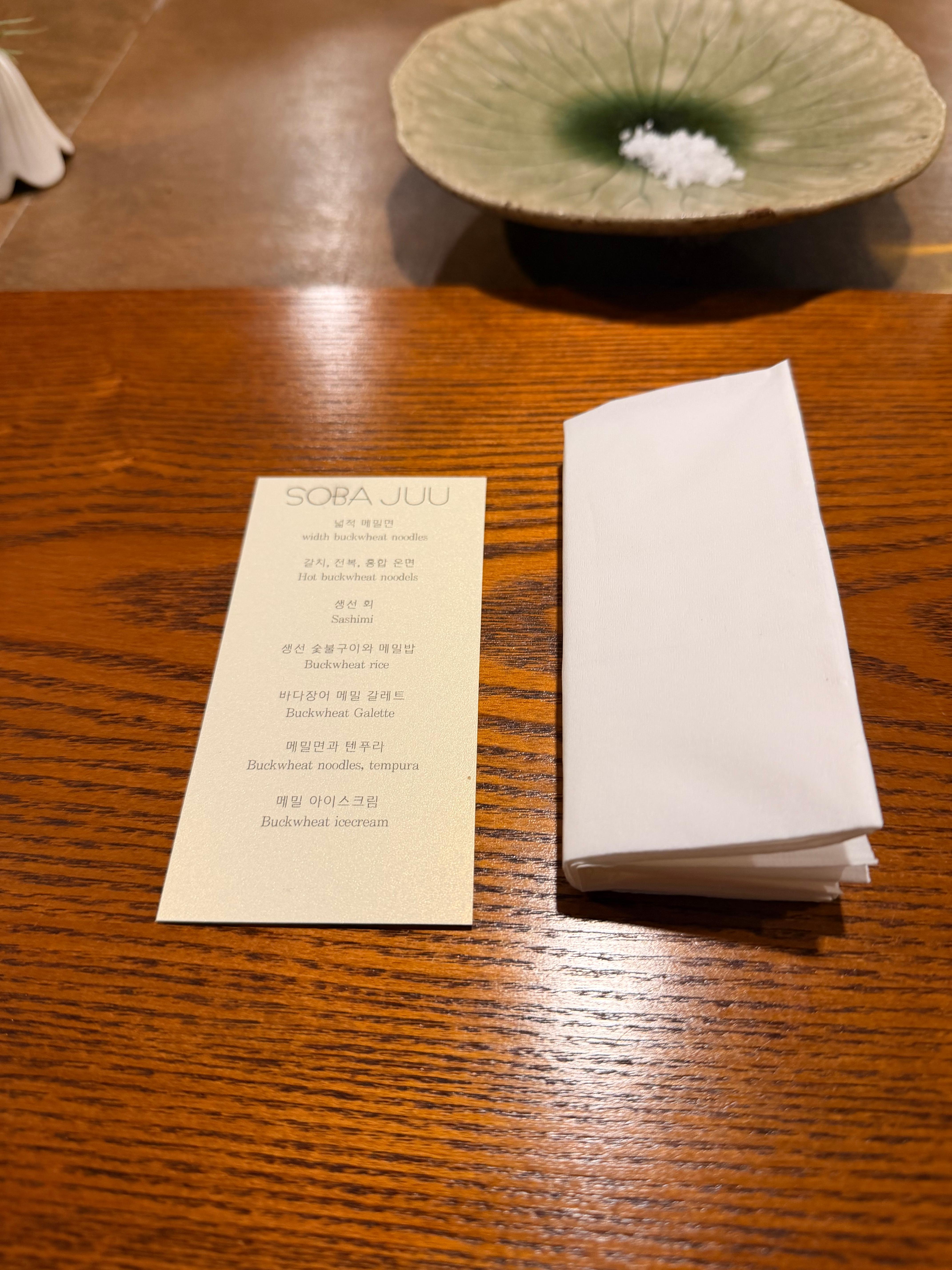 소바쥬는 형제가 함께 시작한 레스토랑으로, 현재는 동생 셰프가 중심이 되어 운영하고 있습니다. 메밀이라는 비교적 한정적인 재료를 바탕으로 오마카세 코스를 구성한다는 점에서 서울에서도 드문 콘셉트의 레스토랑으로 평가받고 있습니다.