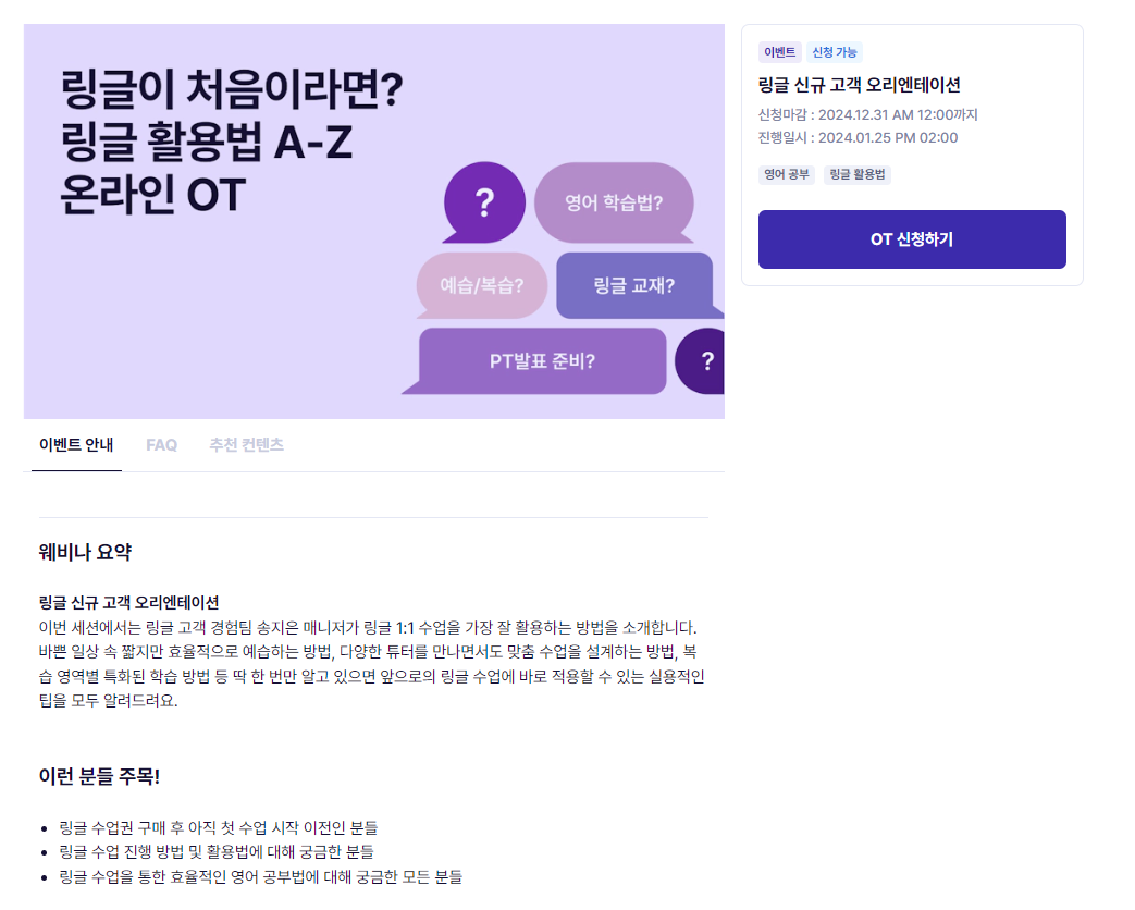 또한, 수강을 하게 된다면, 어떻게 효율적으로 이용하는게 중요한데, 이런 점에서 링글 운영진들은 사람들을 링글에 본딩 시켜주기 위해서 다양한 프로그램을 만들어서 활용성을 높이기 위해 노력하는 것 같습니다.