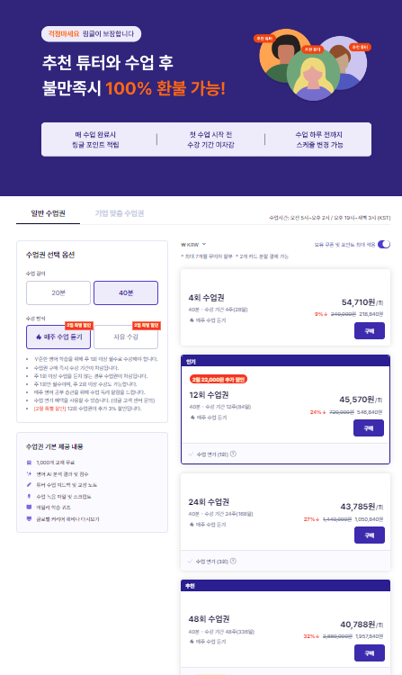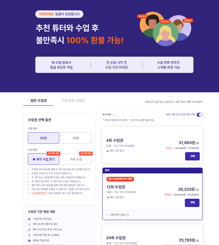링글의 수업은 20분과 40분으로 구성되어 있습니다. 보통 그렇듯이 장기간 여러횟수를 수강하게 되면, 가격이 낮아지게 됩니다.