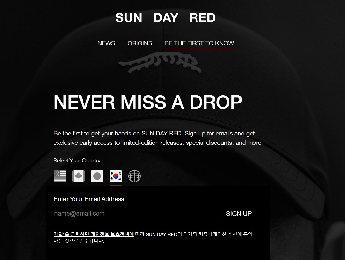 새로운 드롭이 나올 때 마다 선데이 레드 홈페이지를 통해 메일링을 신청한다면, 선데이 레드의 신상에 대해서 알 수 있습니다. 고르는 나라중에 우리나라도 있습니다.